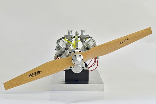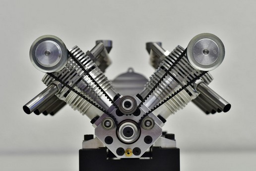 Anbei einige Fotos und zwei Videos des V2-Motors gefertigt von Bruno Engert aus der Schweiz. Herr Engert hat gleich 2 Motoren davon gefertigt und hat den ersten Motor innerhalb eines knappen Monats fertig gestellt. Es wurden ca. 120 Stunden dafür benötigt, inkl. der Fertigung der dafür benötigten Vorrichtungen und Spezialwerkzeuge. Herr Engert schreibt hierzu: "Habe alle Teile wie Kugellager und Zahnriemen/Räder im Doppel eingekauft und werde mir dann mit den gesammelten Erfahrungen dieses Motors, einen zweiten Motor bauen. Ein paar Dinge lassen sich noch verbessern, obwohl die Pläne keine Fehler haben. Einiges wird rein kosmetisch sein, anderes wird Sinn machen. Aber zuerst muss der noch seinen eigenen Vergaser bekommen und davon werde ich dann gleich 2 Stück bauen. Kopieren kann ich ja den vom neuen 15 ccm OS-Max Motor mit dem er im Moment läuft. Schon ein besonderes Gefühl wenn die aufgewendete Arbeit und Zeit sich dann so auszahlt!"