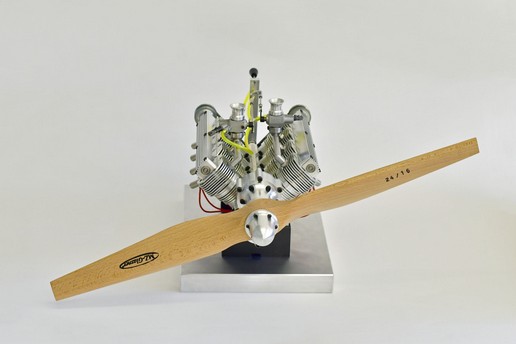 Auf einem der Fotos sieht man einen der fertig gestellten 2-Zylinder-Boxermotore auf dem Prüfstand. Montiert ist eine 22/10"-Holzluftschraube der Fa. Menz mit einem Durchmesser von 56 cm x 25,4 cm Steigung.