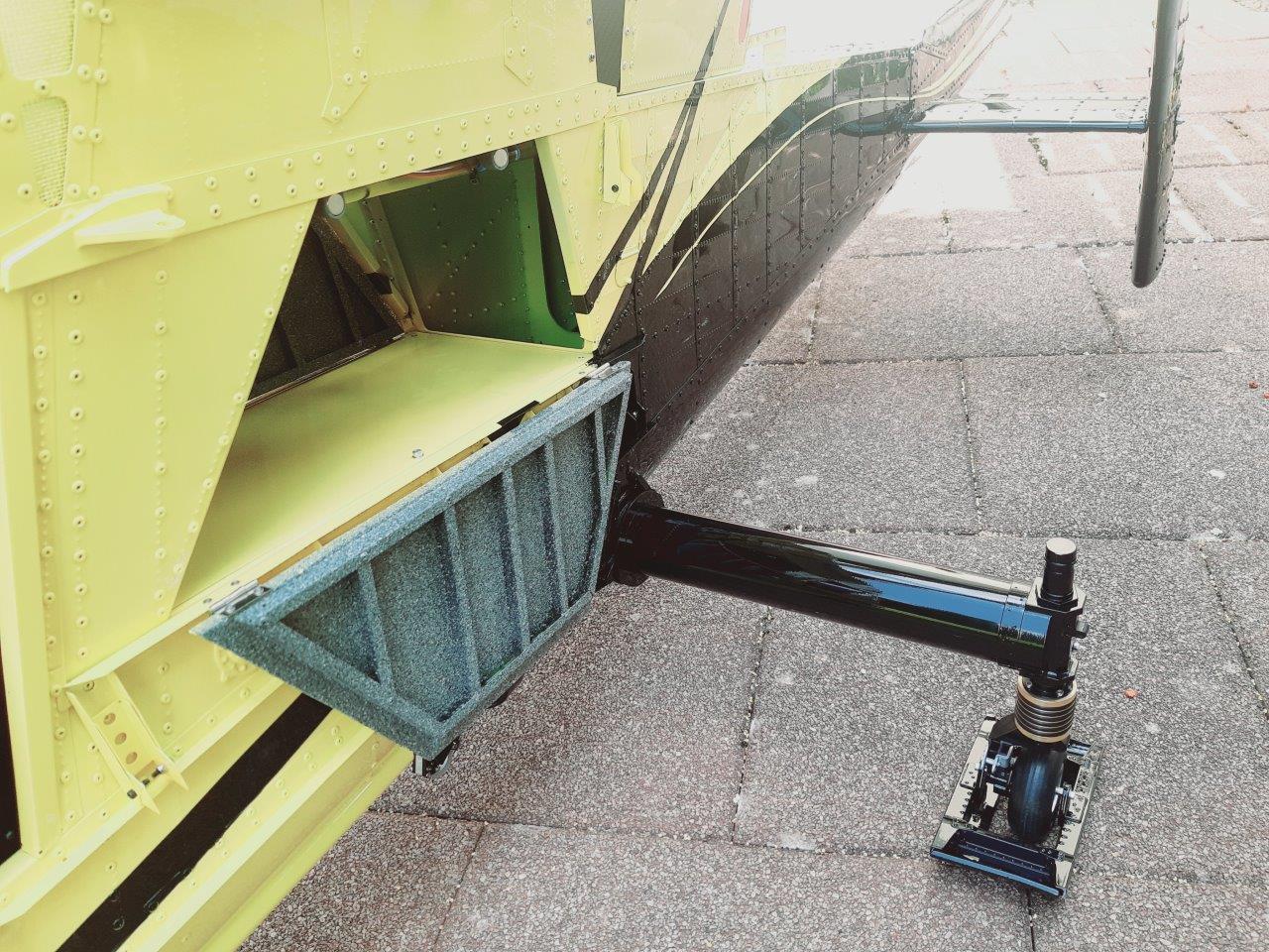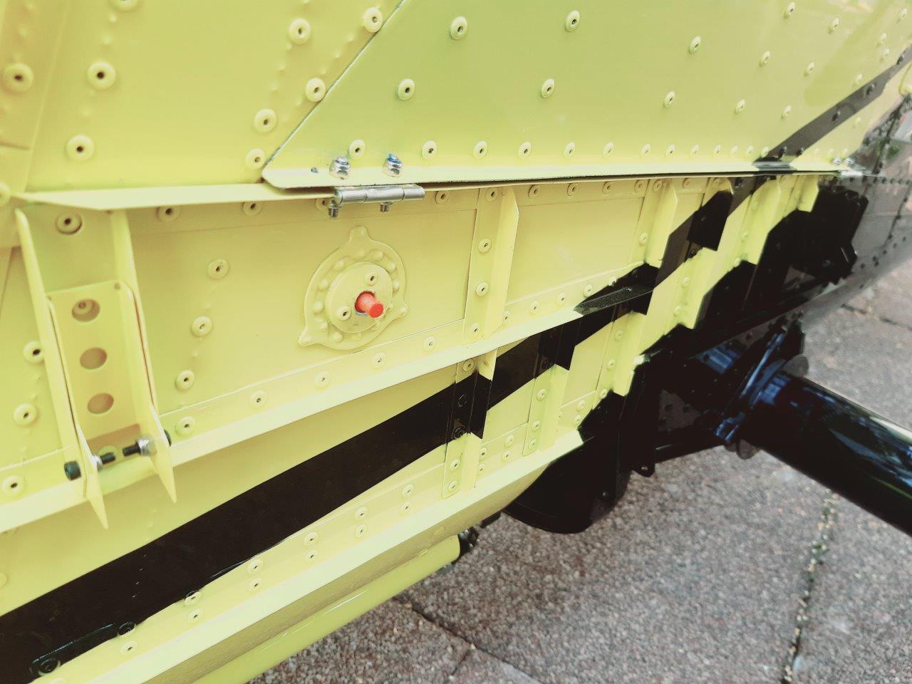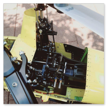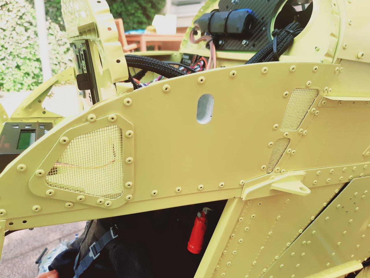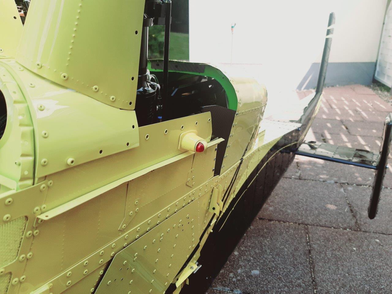 Die Rumpfzelle, gefertigt durch die spanische Firma www.alumodels.com, im Vertrieb durch Klaus Weise (XXL-Modelhelicopter) ist dabei komplett in Aluminium gefertigt, d.h. genau wie das Original ausgeführt. Mehr Scale geht nicht! Die dünnen Aluminiumbleche der gesamten Rumpfzelle sind innen mit einem stabilen Chassis aus Edelstahlblechen zu einer stabilen Einheit vernietet.